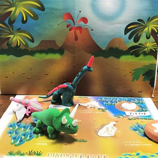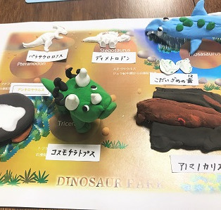 恐竜は今日で終わりなので、最後に1回目から作ってきた恐竜や化石をジオラマのように並べました!みんなかなり恐竜博士になりました~。
